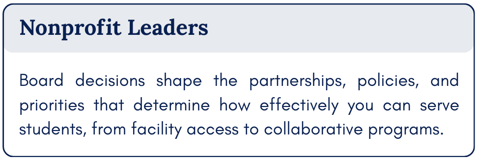 Whether you're a parent, a professional, a community member, or a future board member, there's a place for you at the table: