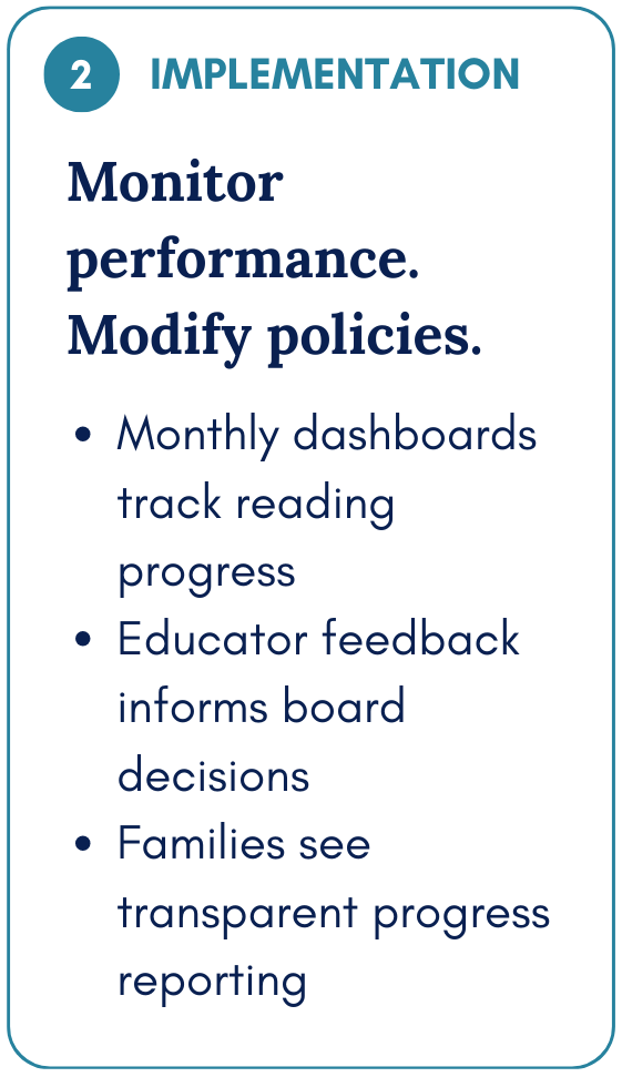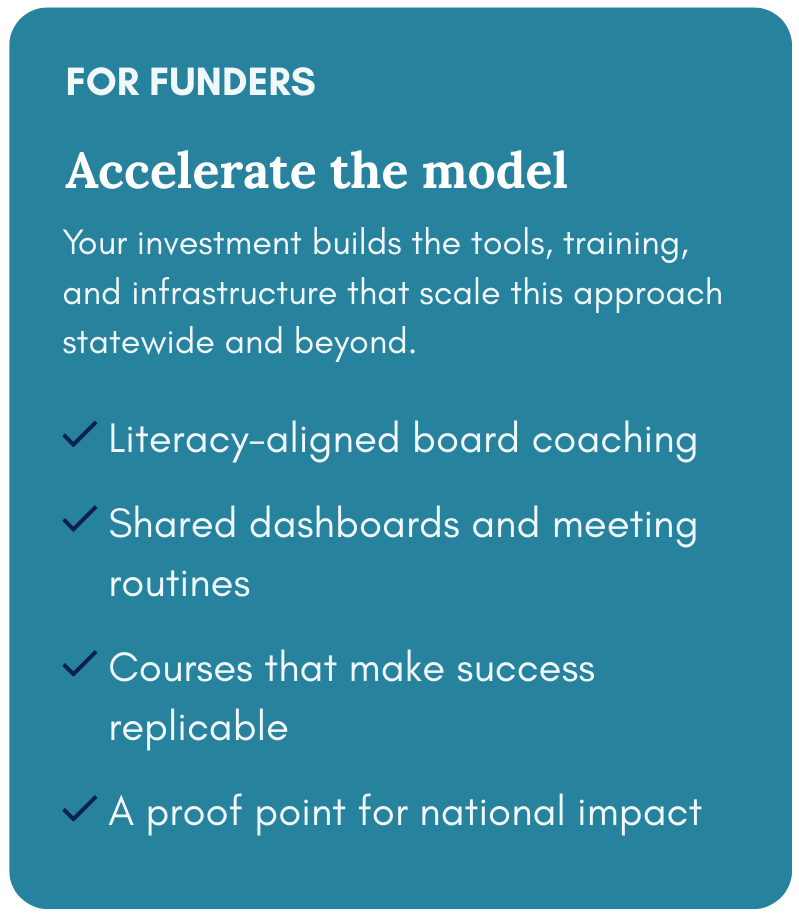 This pilot demonstrates that when boards are trained, supported, and held accountable, student outcomes improve. The goal is measurable, public, and tied directly to governance decisions.