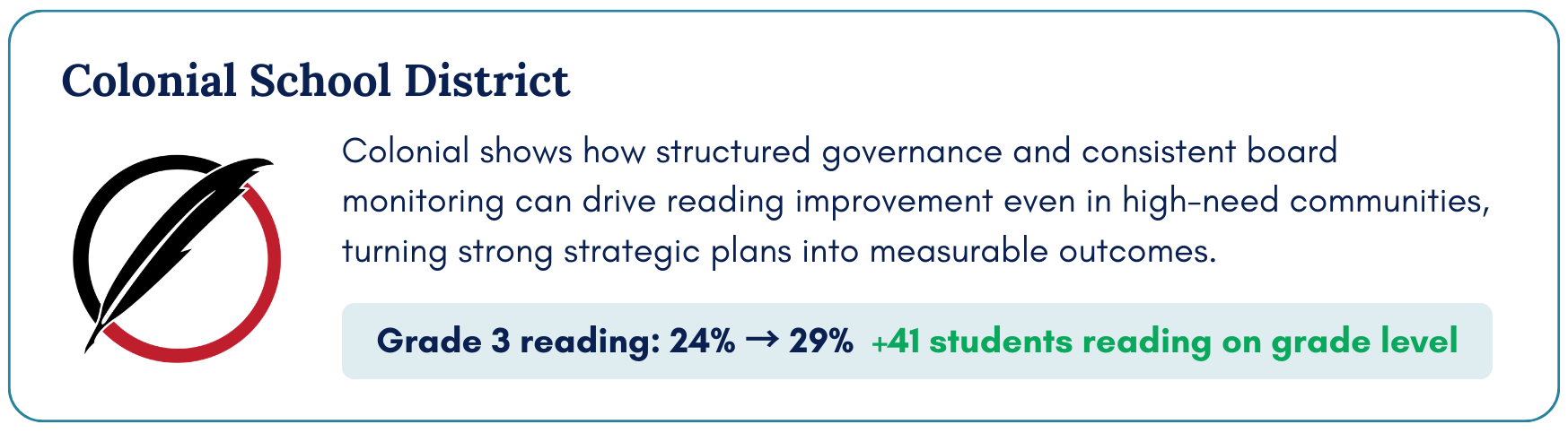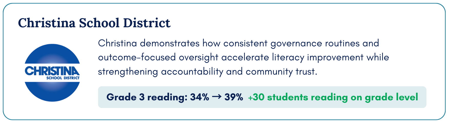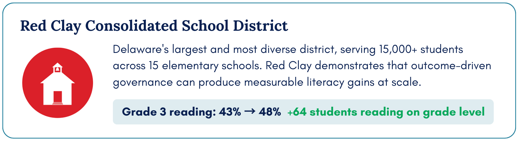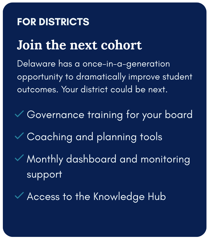 Christina, Colonial, and Red Clay school districts are the first to participate in this pilot, each with a public, measurable literacy target and a board-superintendent team trained to govern for results.